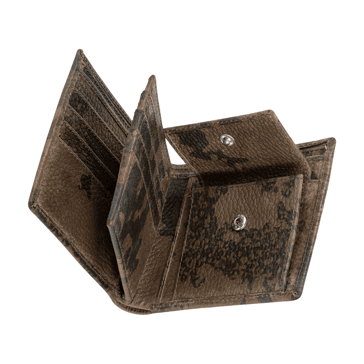 Der Geldbeutel ist aus robustem Echtleder gefertigt und mit einem markanten Camouflage-Muster versehen. Dieses spezielle Design sorgt nicht nur für eine ansprechende Optik, sondern bietet auch zusätzlichen Schutz in der freien Natur. Die kompakte Größe und das leichte Gewicht machen ihn zum idealen Begleiter für jede Jagd- oder Outdoor-Aktivität.