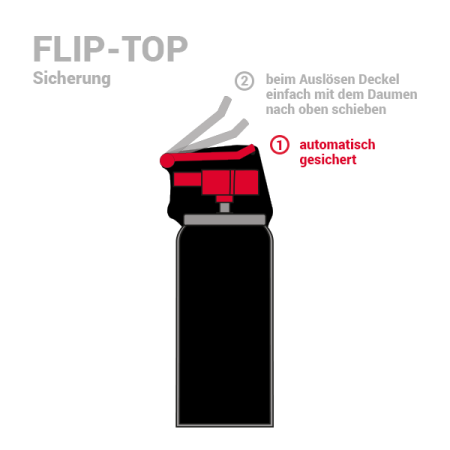 Das Pfefferspray ist mit einer hochwertigen Flip-Top Kappe ausgestattet, welche das unbeabsichtigte Auslösen des Sprays verhindert: Durch das intelligente System mit federunterstütztem Klapp-Deckel wird der Sprühkopf vor Druckeinwirkung gesichert. Beim Betätigen der Auslösetaste schieben Sie mit dem Daumen den Deckel nach oben. Der Deckel klappt anschließend selbsttätig wieder nach unten.